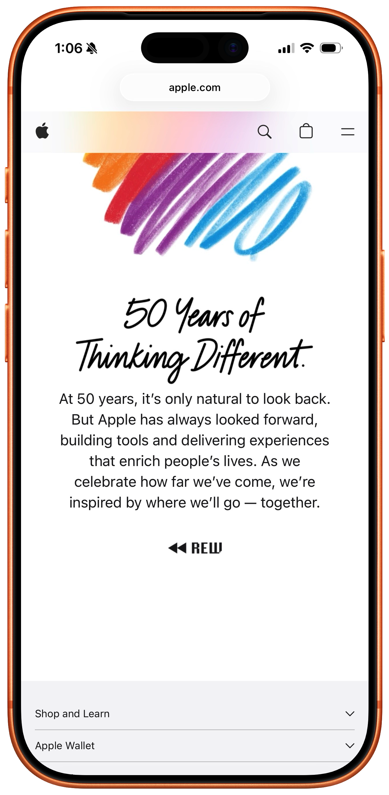 Tim Cook posted a different video on Twitter/X, a VHS-style “rewind” through Apple product history. This one’s more fun. There’s absolutely exquisite audio glitch at a certain moment — chef’s kiss. Bit of a shame that it’s only on X as far I know. Update: Ah, Apple posted the same video to their homepage, linked to a “◀︎◀︎ REW” button set in bitmapped Chicago 12, but it’s seemingly only shown when you visit on an iPhone. I don’t see the button from my Mac or iPad. But you should be able to watch the video from any device at this link. (I would have awarded bonus points for making the “◀︎◀︎” triangles pixel art too. I mean, come on!)