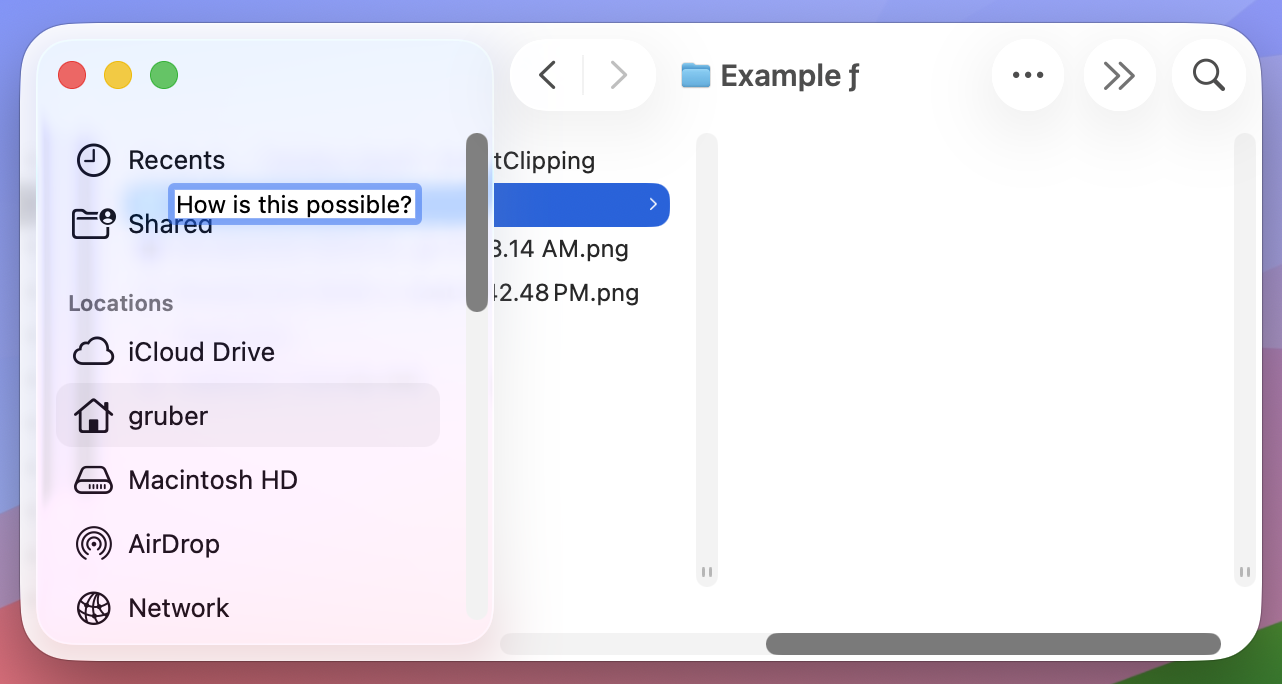 This new feature in the Tahoe Finder attempts to finally solve this problem. I played around with it this afternoon and it’s ... OK. It feels like an early prototype for what could be a polished feature. For example, it exacerbates some layering bugs in the Finder — if you attempt to rename a file or folder that is partially scrolled under the sidebar, the Tahoe Finder will just draw the rename editing field right on top of the sidebar, even though it belongs to the layer that is scrolled underneath. Here’s what it looks like when I rename a folder named “Example ƒ” to “How is this possible?”: