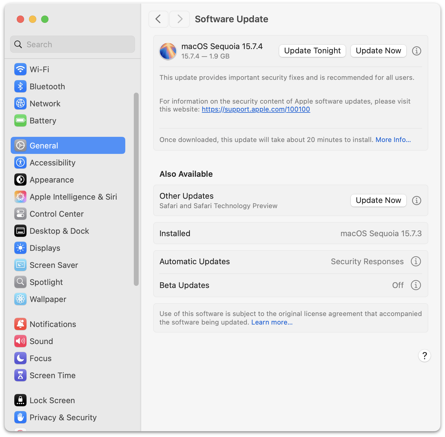 I waited to link to Griffiths’s post until I saw the pending update from Sequoia 15.7.3 to 15.7.4, just to make sure that was still working. And here it is. My Software Update panels makes it look like Tahoe doesn’t even exist. A delicious glass of ice water, without the visit to hell.